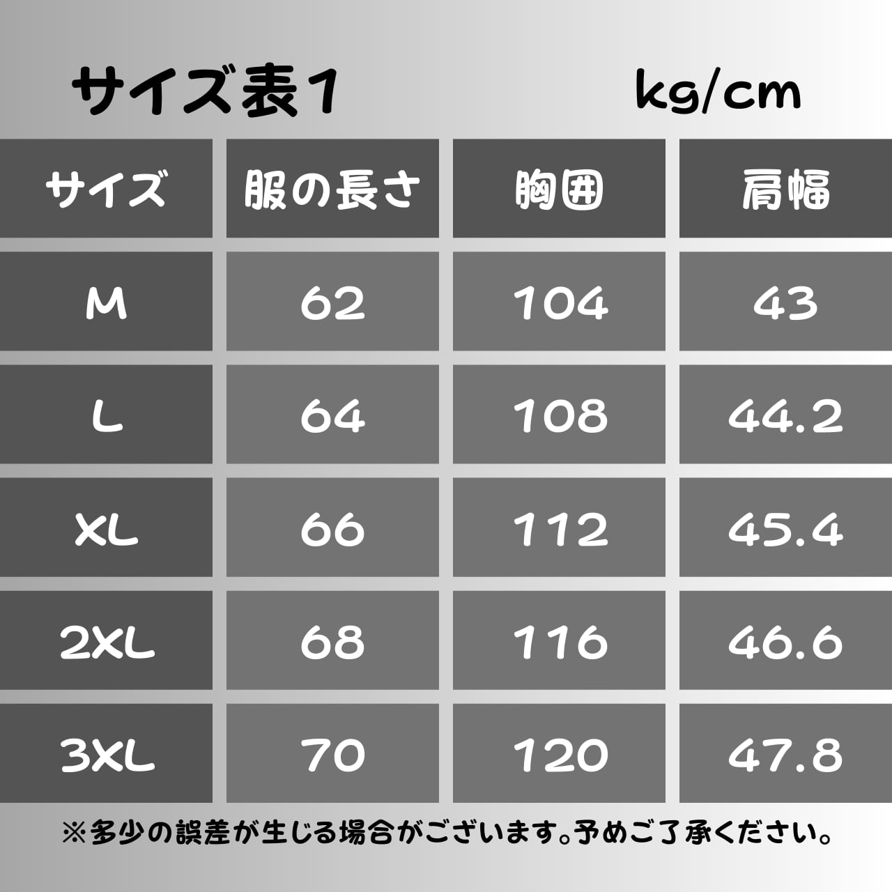 ・サイズ:M、L、XL、2XL、3X、4XL、5XL、6XL、7XL、8XL